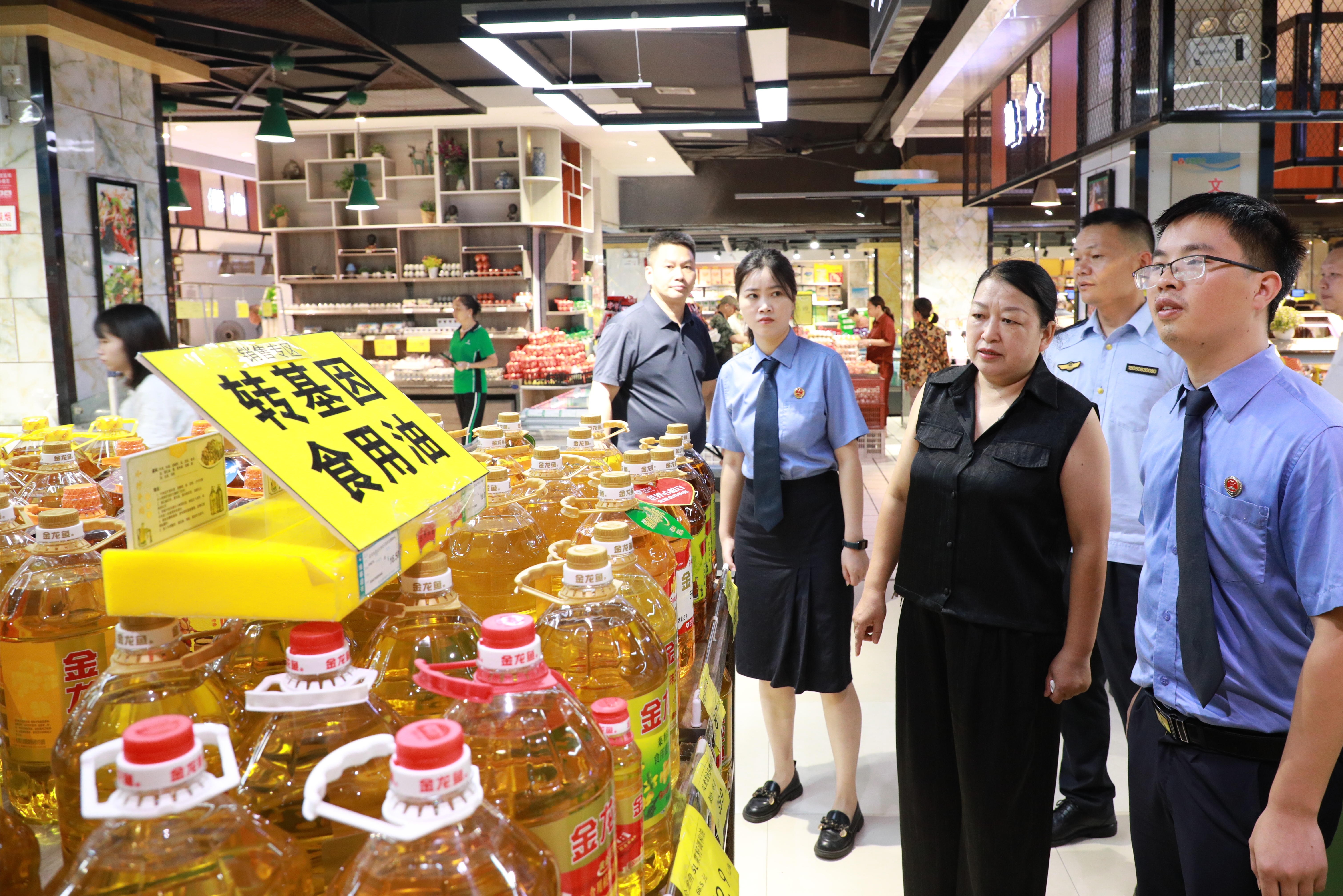 8月21日上午,绥宁县人民检察院联合县市场监督管理局对县城区域内大型超市开展转基因食用油销售情况"回头看"专项检查。此次行动重点核查转基因食用油是否规范设置标识和专门销售区域,旨在巩固前期监督成果,确保食品安全要求全面落实。